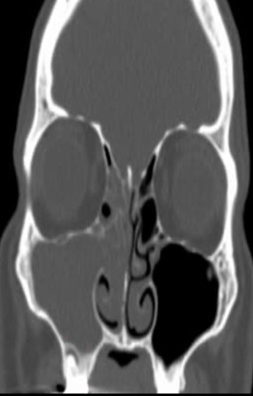 Findings right maxillary sinus is completely opacified. Extensive soft tissue density material is also present in the ipsilateral nasal cavity and the right ethmoid sinus is nearly completely opacified.
