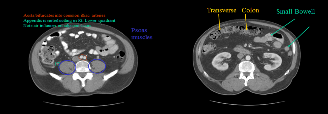 CT can show the full width of the wall of the structures in question as well as the surrounding fat.