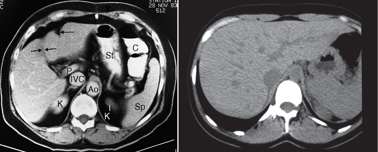 CT scan of normal liver (enhanced scan). Ao, aorta; C, colon; IVC, inferior vena cava; K,kidney; P, portal vein; Sp, spleen; St, stomach. The single arrow indicates a fissure for the falciform ligament, and the double arrows a fissure for the gall bladder, which divides the liver into the right and left lobes.