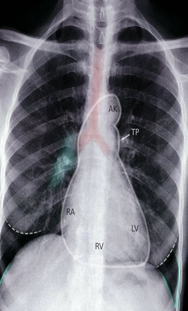 LV: left ventricle; RV: right ventricle; RA: right atrium; PT: pulmonary trunk (white arrow); AK: aortic knob; Trachea: red overlay, Breast shadow: white dotted outline