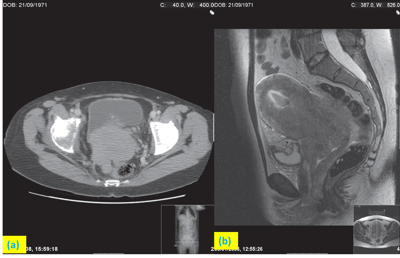 (b) Sagittal T2-weighted MRI demonstrating a polypoid tumour mass distending the endometrial cavity