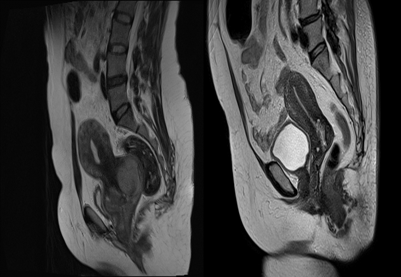 Two different cases. T2 weighted sagittal MRI showing carcinoma of cervix