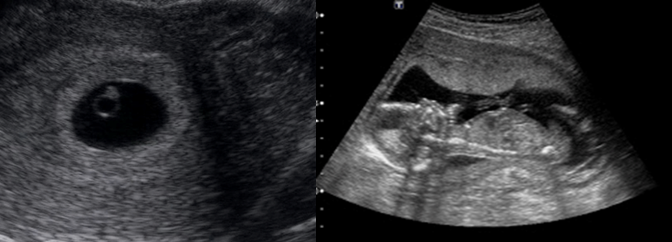 - In an intrauterine pregnancy at 5–6 weeks’ gestation, a gestational sac and yolk sac are visible in the uterus.