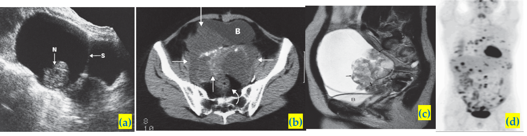 Ultrasound, CT and MRI may show hydronephrosis from ureteric obstruction by the tumour and may also demonstrate -enlarged lymph nodes, liver metastases or pleural effusions.