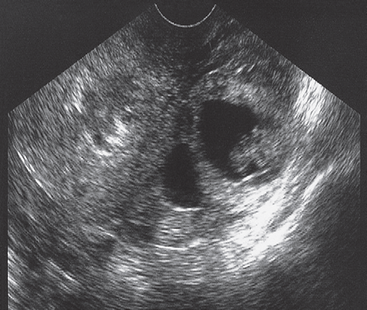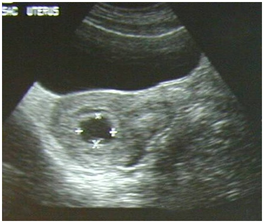 - Empty uterine cavity in combination with a thickened endometrial lining.