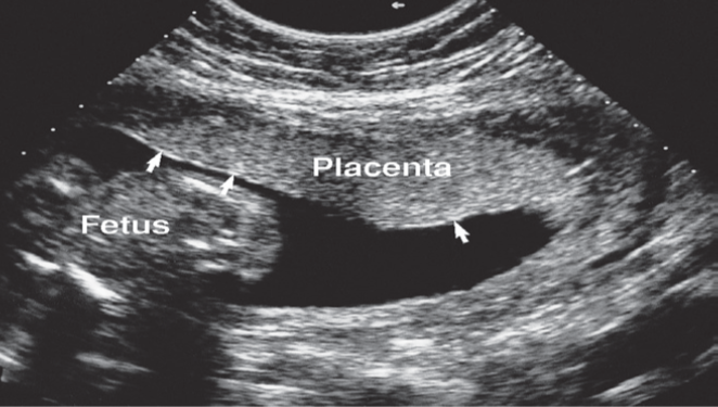 Placenta seen on a longitudinal scan at 18 weeks’ gestation. The chorionic plate is seen as a thin line of bright echoes (arrows).
