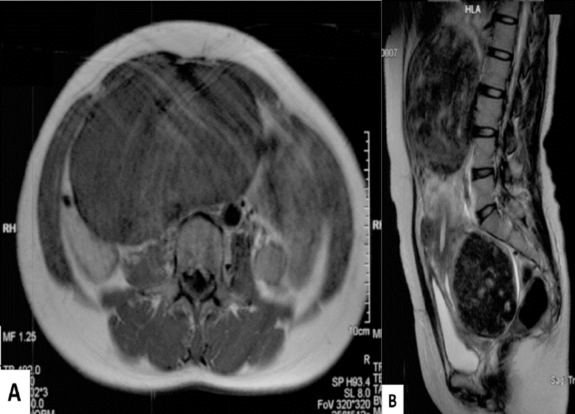 MRI abdomen and pelvis (A: T1 weighted, axial plane; B: T2 weighted, sagittal plane) of a 41-year-old female patient with a visible and palpable lower abdominal mass, hypermenorrhea, and pressure symptoms.