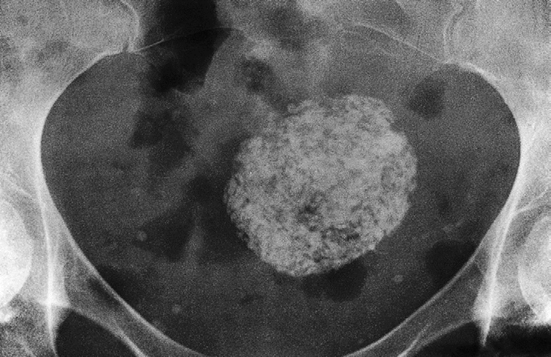When sufficiently large, a fibroid can be seen on a plain film as a mass in the pelvis and may show multiple irregular but well-defined calcifications