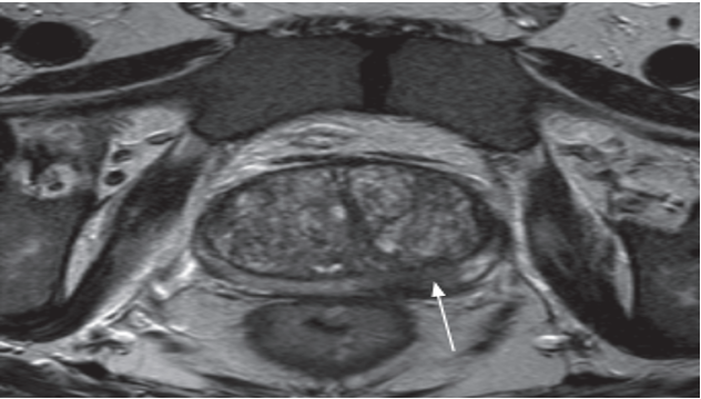 MRI of early prostate cancer. (a) T2-weighted MRI demonstrating focal low signal intensity in the left peripheral zone (arrow)