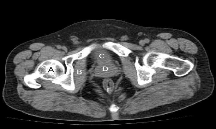 (A) Right femoral head(B) Right obturator internus muscle(C) Urinary bladder(D) Prostate(E) Rectum