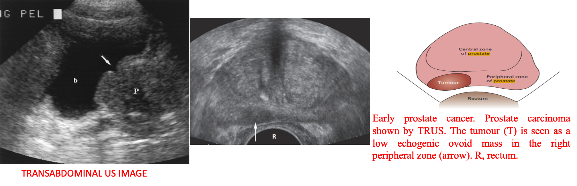 cannot distinguish benign from malignant disease when confined to the prostate, except on the basis that masses in the peripheral zone are likely to be malignant and those in the central zone are more likely to be benign.