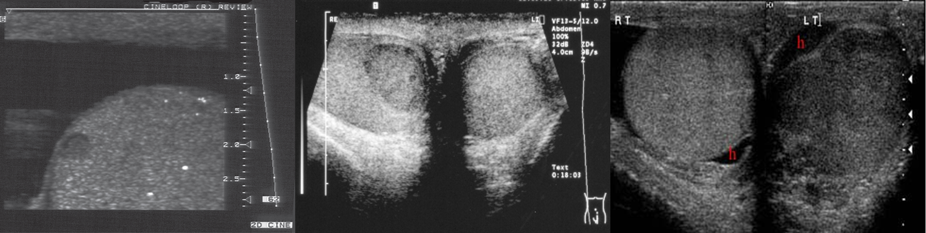 Ultrasound of a testis demonstrating a small seminoma. Several very bright echogenic specks of microcalcification are seen Reactive Hydrocele 3rd img