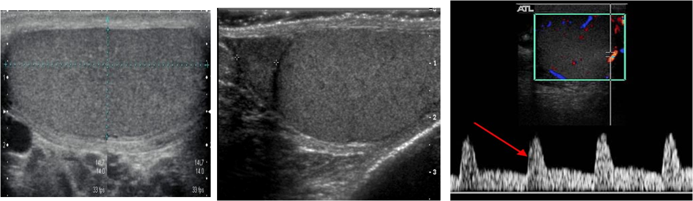 Normal intratesticular arterial blood flow is consistently detected with power or ***color Doppler ***