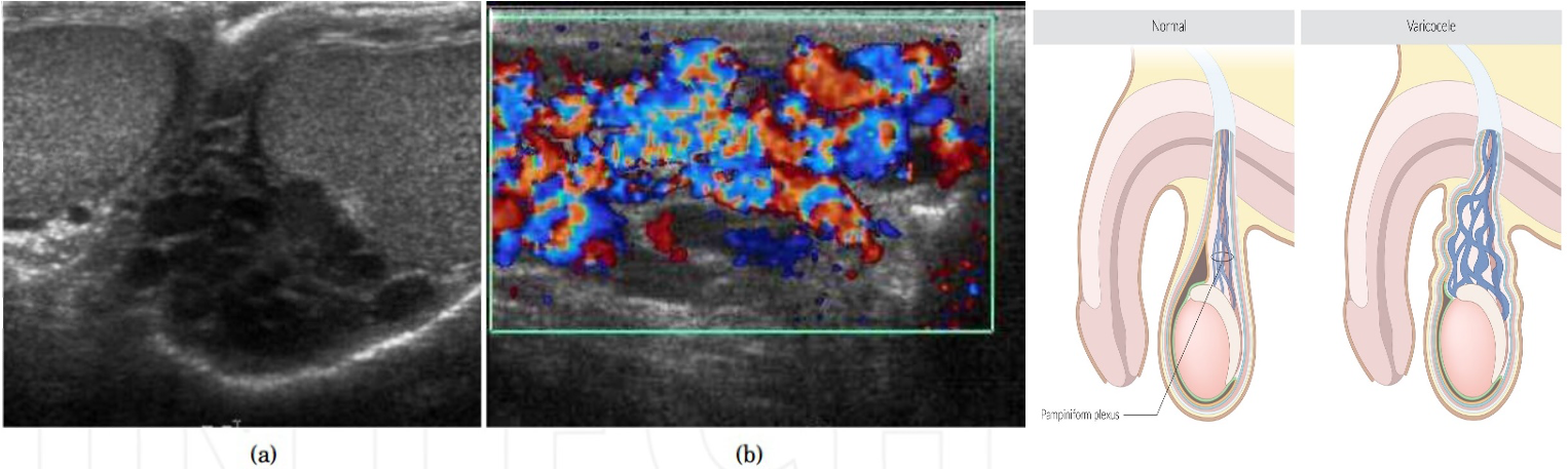- Dilatation of pampiniform plexus veins increase with Valsalva maneuver characteristically have a serpiginous appearance