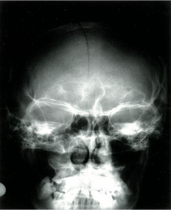 X-ray skull (PA view) A cranial vault fracture is seen as a linear lucency paralleling the sagittal suture