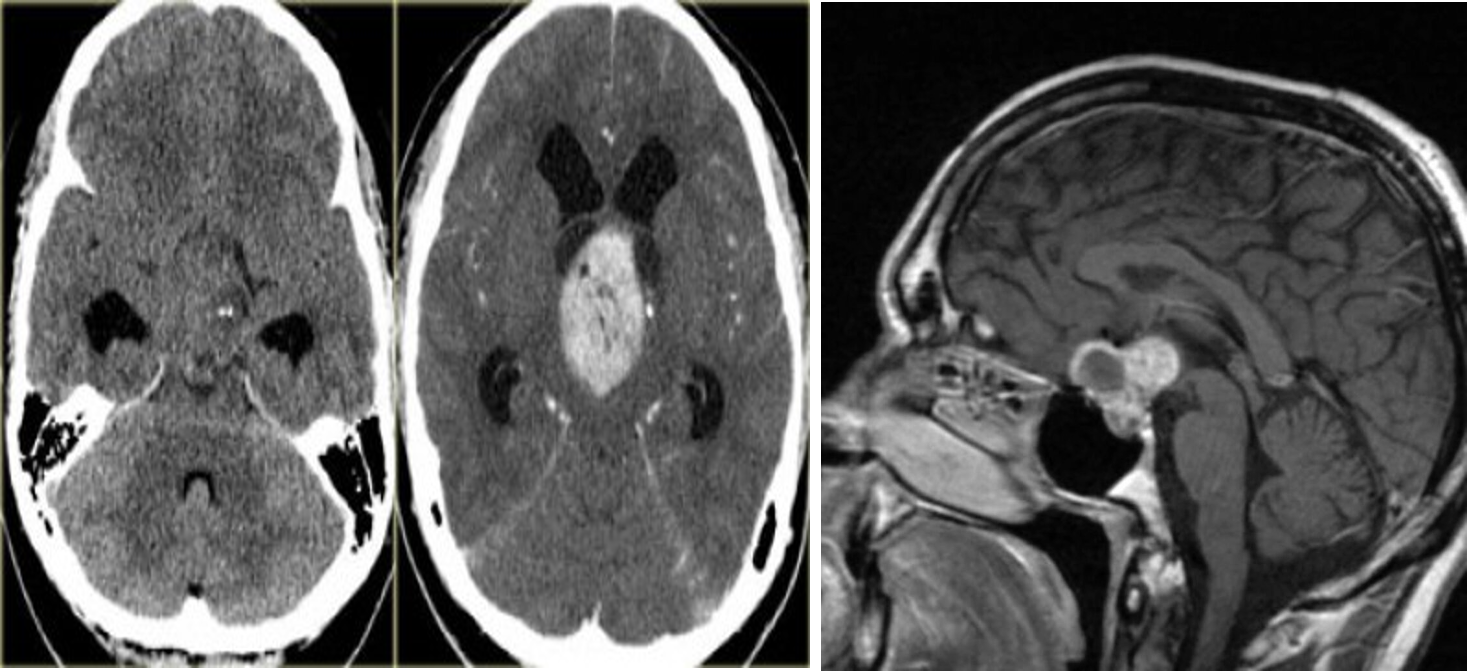 C) MRI head (T1 weighted; with contrast; sagittal of a patient with acute visual loss in the right eye - There is an intrasellar and suprasellar mass with both cystic and solid portions. The solid portions show strong contrast enhancement.