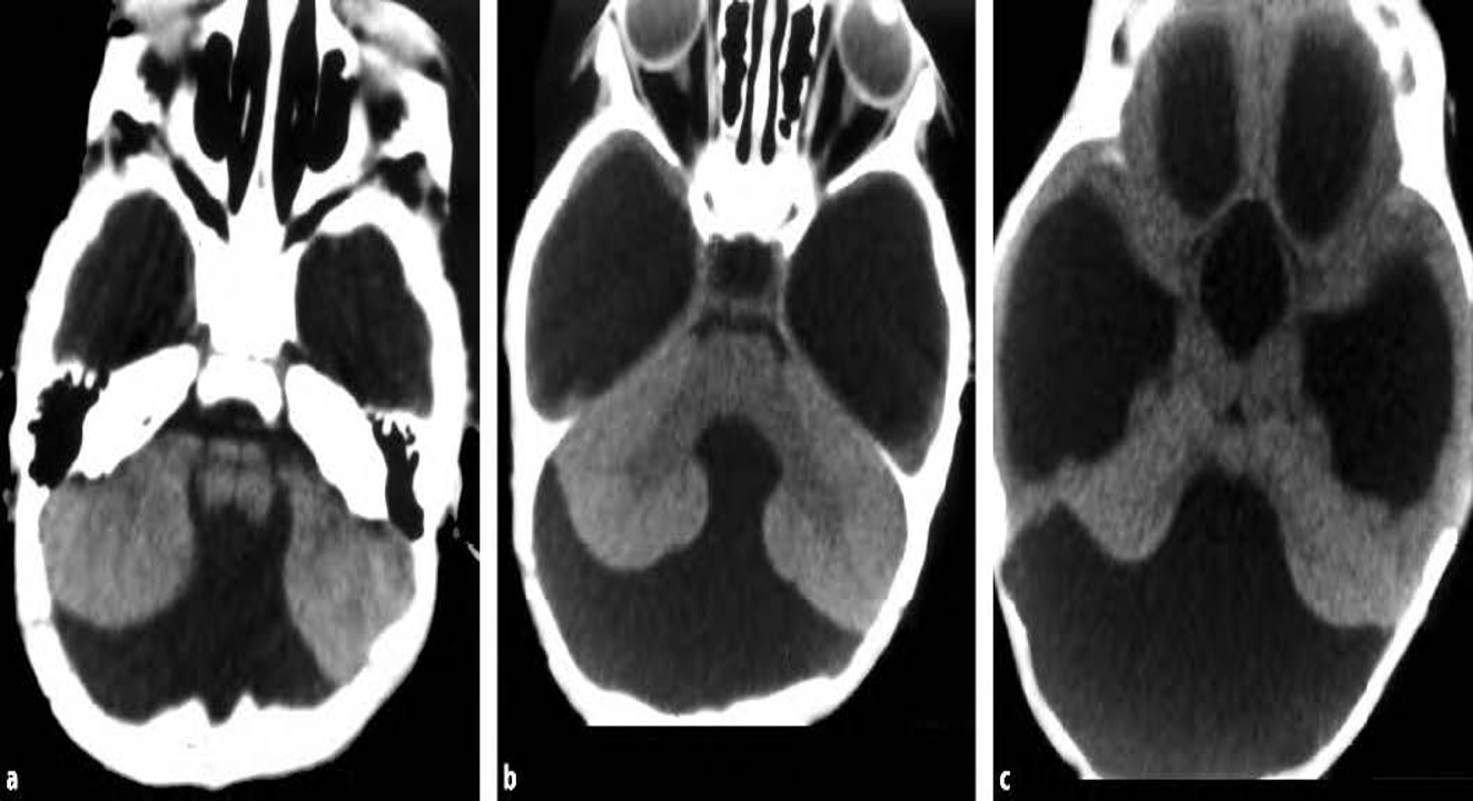 Absent cerebellar vermis. Large posterior fossa cyst communicating with fourth ventricle. Third ventricle, frontal and temporal horns of lateral ventricles are dilated.