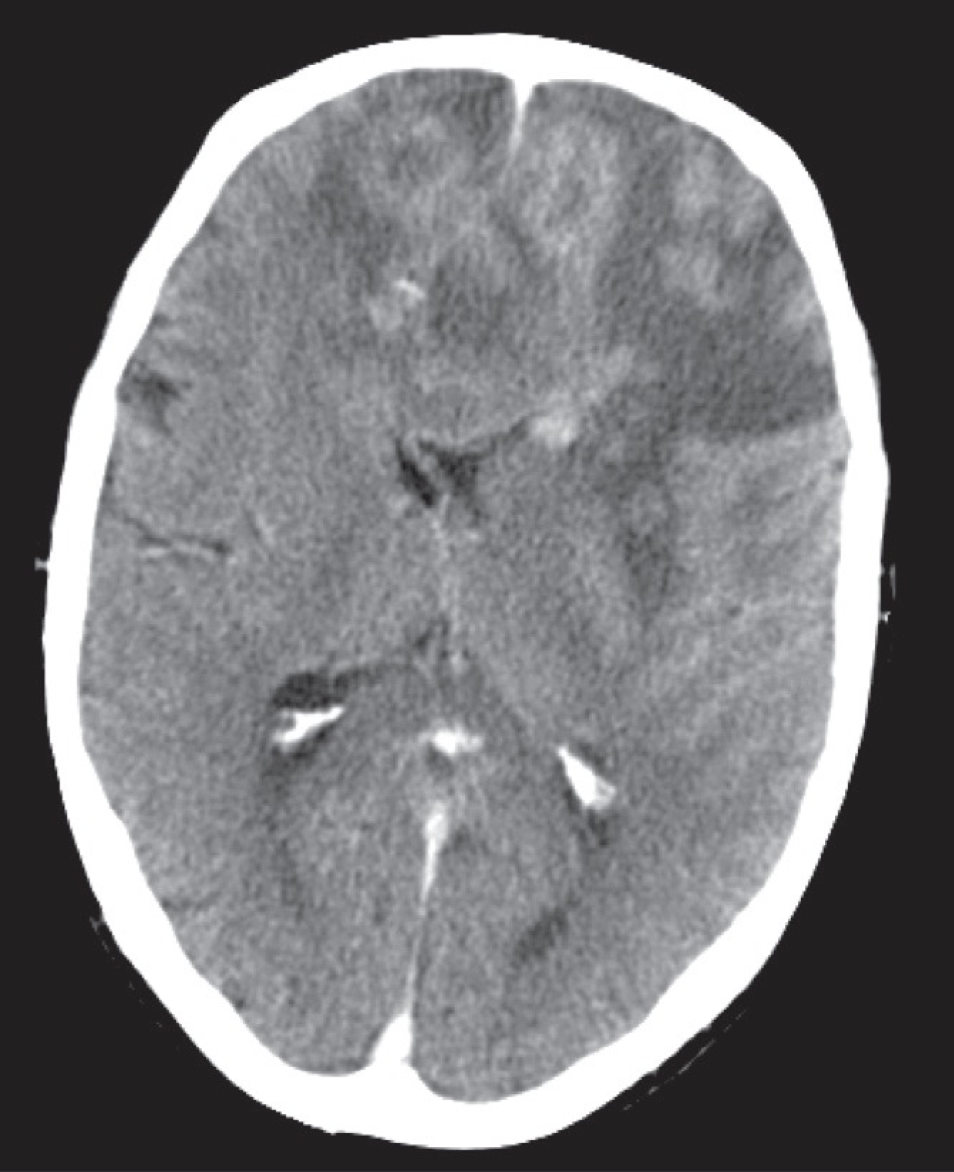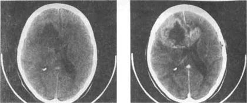 showing an irregular enhancing mass with surrounding low attenuation involving both frontal lobes and the corpus callosum, in keeping with a high grade glioma (glioblastoma multiforme).