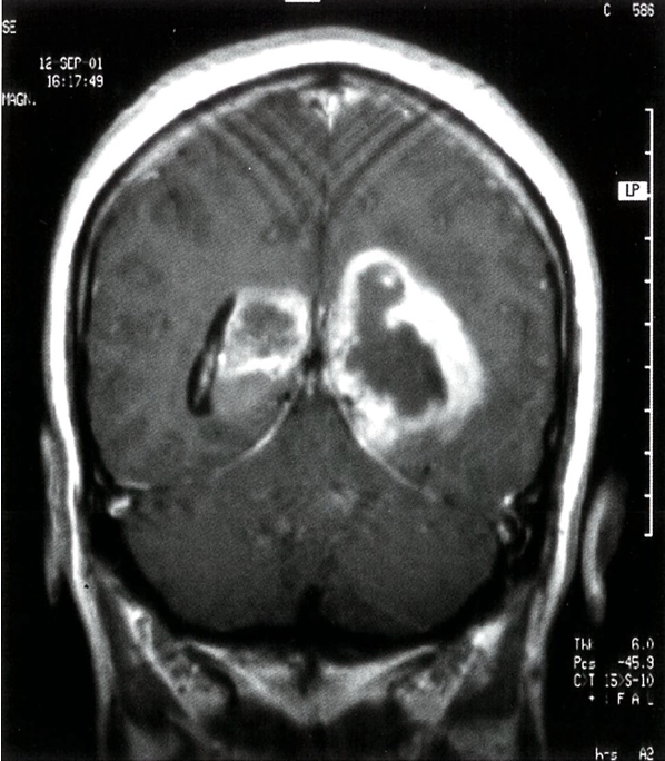 T1-weighted contrast-enhanced MRI: bihemisphere contrast enhancement lesion. There is peripheral contrast agent enhancement. The third ventricle is centrally located. The tumor is displacing the posterior horn of the lateral ventricle .
