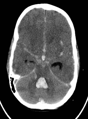 - Blood, being denser than CSF, has settled in the posterior horns of the lateral ventricles as these areas are dependent fluid-filled portions in the supine position.
