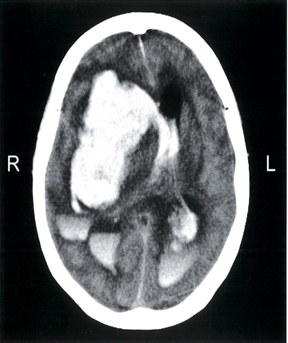 - The large hyperdensity in the region of the right basal ganglion indicates a massive intracerebral hemorrhage that has caused a midline shift to the contralateral side. There are focal areas of cerebral edema (hypointense (black) areas) in the perihemorrhagic area. The hemorrhage has extended into the lateral ventricles ,