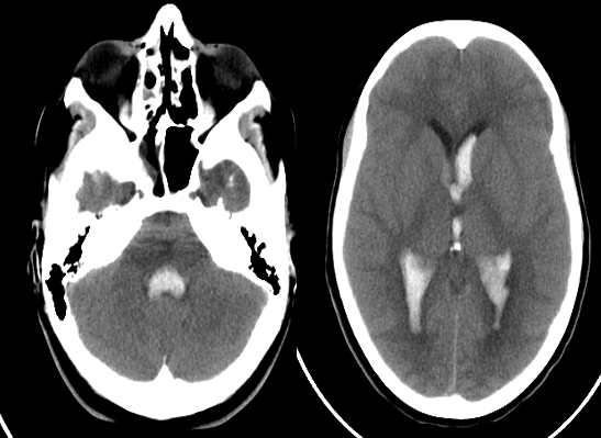 blood in 3rd and 4th ventricles hyperintense - (((with compression of lateral ventricular temporal horns