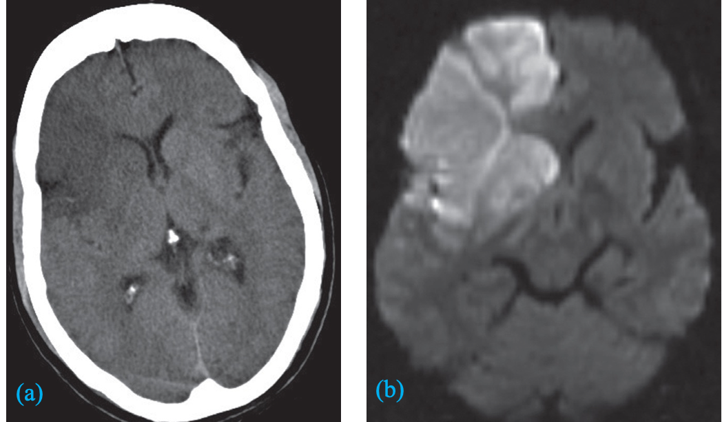 B) Diffusion-weighted MRI showing bright signal indicating an acute infarct