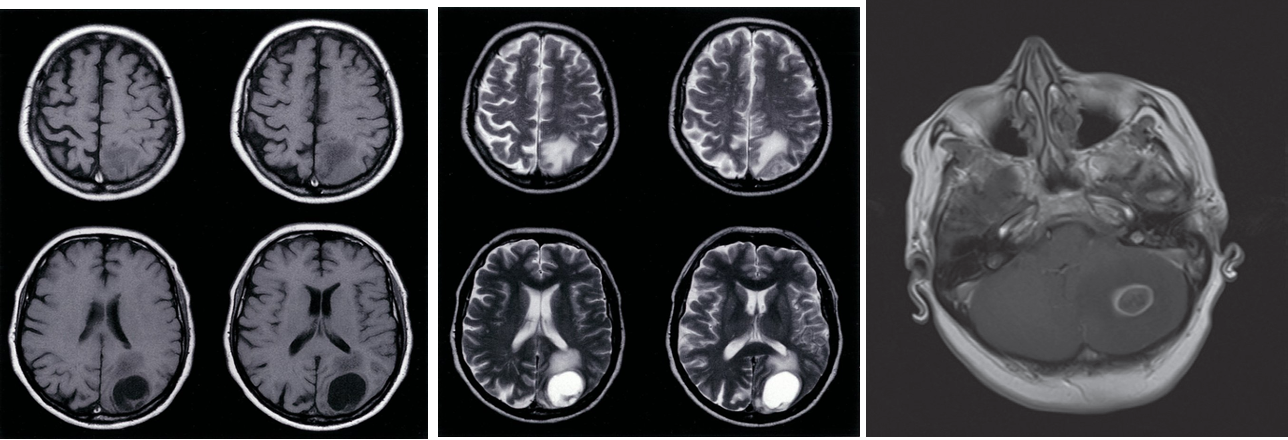 MRI head (T1 & T2-weighted; without contrast; axial plane) of a patient with lung carcinoma. A solitary, well-circumscribed, predominantly hypointense (T1) hyperintense (T2) mass in the left occipital lobe is accompanied by perifocal edema