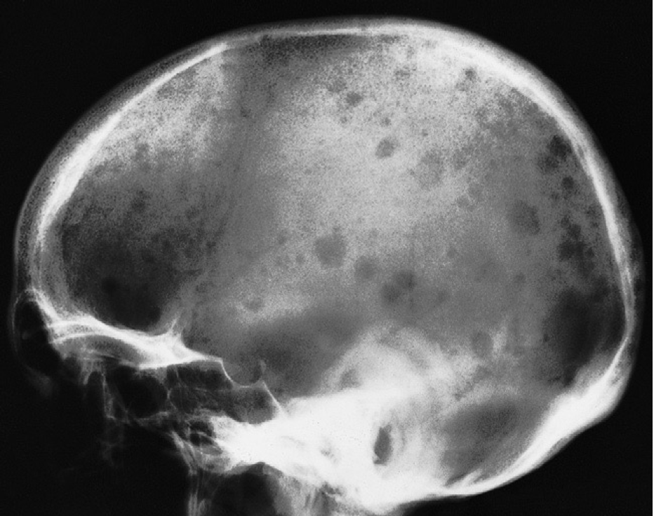 Multiple well-defined lytic lesions of various sizes are seen in all areas of the skull vault.