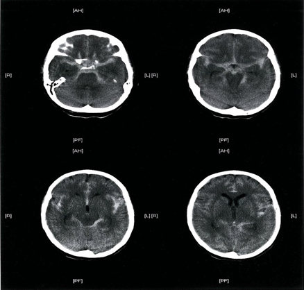 Multiple areas of high attenuation in the basal cisterns, Sylvian fissures, and sulci are characteristic of extensive subarachnoid hemorrhage.