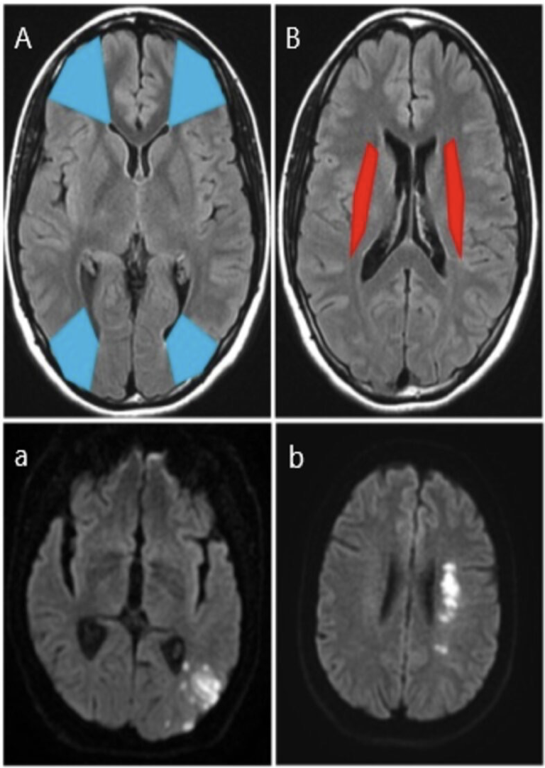 MRI head (A and B: FLAIR; a.and b.; DWI) Cortical border zones, or watershed areas (A; blue), are located between the ACA and MCA territories and the PCA and MCA territories. A left occipital infarct (a; white) is shown at the boundary between the middle and posterior cerebral territories.