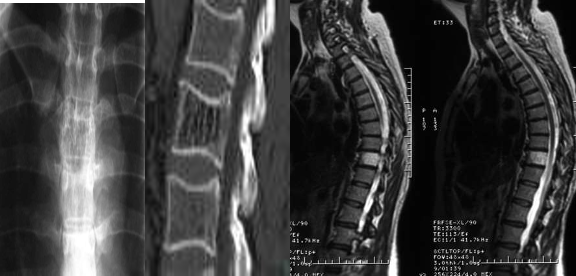 Findings include: sclerotic vertebra with prominent trabecular pattern, and vertical trabeculae.