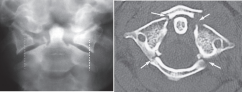 Jefferson’s fracture. (a) Plain film showing overlap of the articular pillars of C1 beyond the margins of the C2 vertebral body (dashed lines) (b) Axial CT showing the fractures of the posterior arch more clearly together with fractures of the anterior arch (arrows)