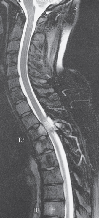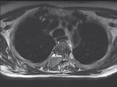 showing metastases from a breast carcinoma in the body and pedicle of T3 causing compression of the spinal cord.