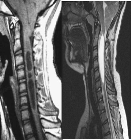 Cystic area within the cord which appears of low signal at the T1WI and of high signal at the T2WI. No enhancement seen within the lesion at post-contrast study.
