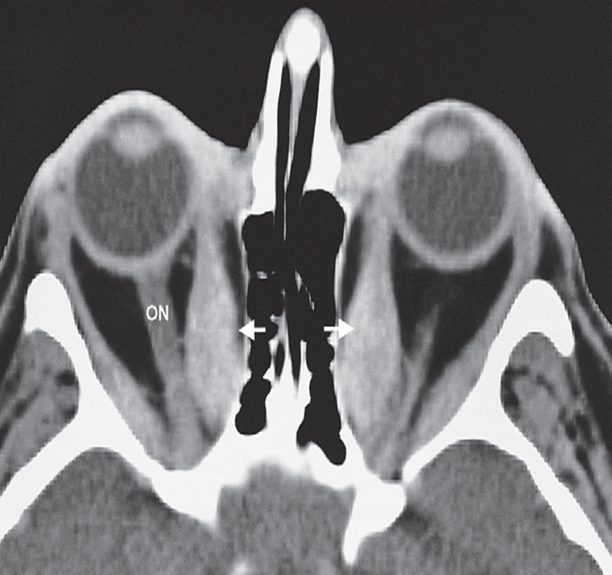 showing enlargement of the extraocular muscles, particularly the medial rectus (arrows). ON; optic nerve.