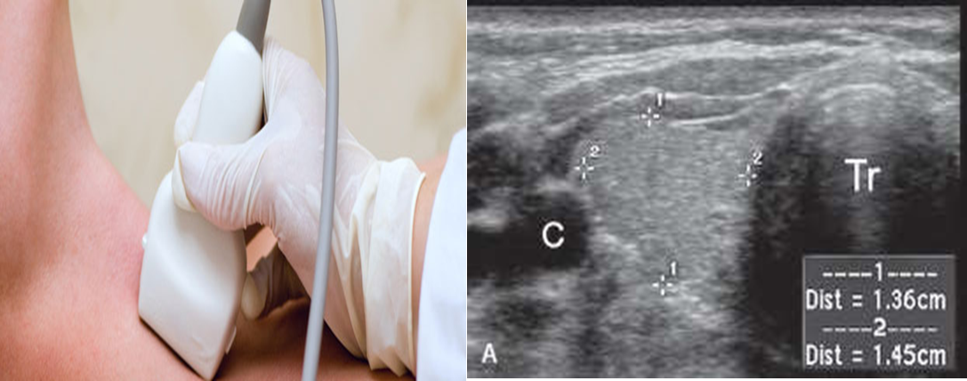 Both right ,left lobes and isthmus are examined .Color Doppler is used to see vascularity. Ultrasound shows anatomical detail of thyroid and adjacent blood vessels and structures.