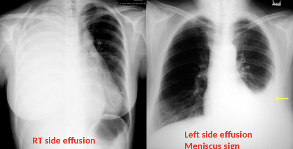 • Large effusion — Complete opacification of the lung — Mediastinal shift — Tracheal_deviation away from the effusion (space-occupying lesion)