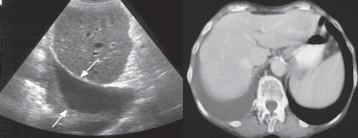 • Lateral decubitus view (most sensitive): allows for detection of fluid collections as small as 5 mL
