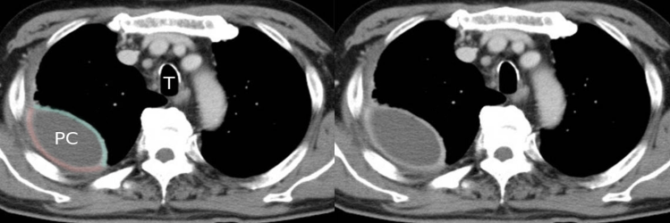• CT scan shows right-sided pleural fluid collection (PC). The collection has a lenticular (biconvex) shape and is accompanied by thickening of the adjacent parietal (red line) and visceral pleurae (green line).