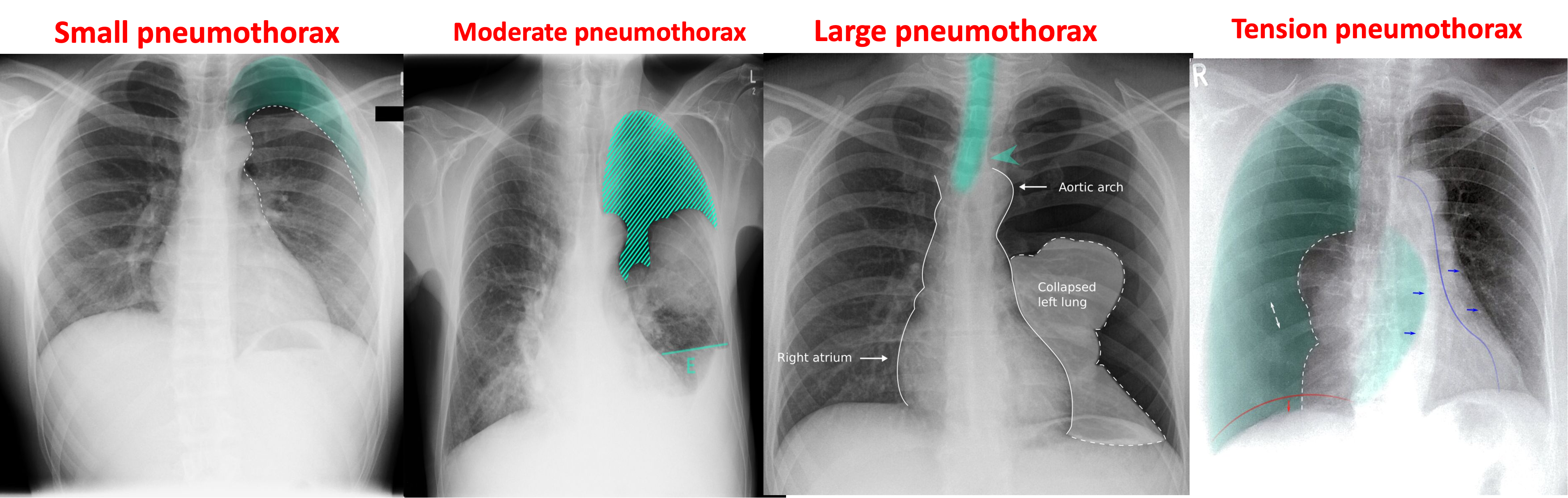 Large Pneumothorax: When more than 50% of the radiographic volume and it causes shift of the trachea and mediastinum.