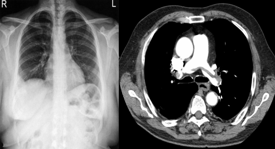 A large embolism is seen, with extension across the bifurcation of the pulmonary trunk into the right and left pulmonary arteries. Straddling of the pulmonary trunk bifurcation by pulmonary embolism is sometimes referred to as saddle embolism.