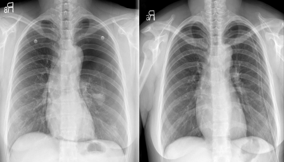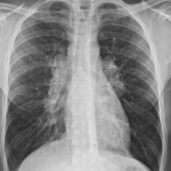 Bilateral hilar adenopathy. The enlarged hila are lobular in outline and dense. The diagnosis in this patient was sarcoidosis. –/// Hilar nodes enlargement - Diff: sarcoidosis, TB, Lymphoma -//