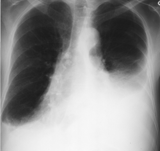 Congestive cardiac failure. There are large bilateral pleural effusions. The heart is enlarged although it is difficult to measure it precisely because the pleural fluid obscures its borders. //– Chest x-ray pleural effusion both, in right costrophrenic & left meniscus sign -