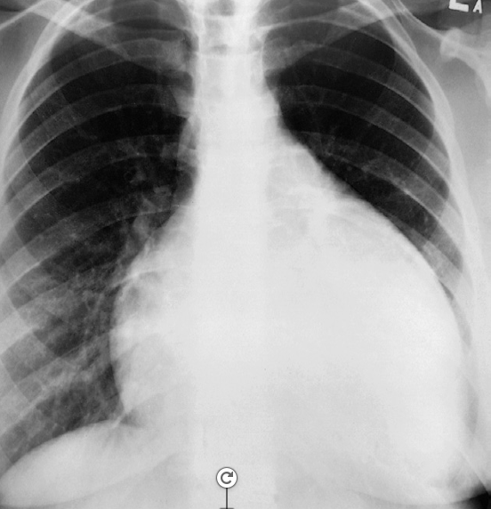 Pericardial effusion. The heart is greatly enlarged. The outline is well defined and the shape globular (Flask - bottle). The lungs are normal. The cause in this case was a viral pericarditis. // Flask shaped, pericardial effusion