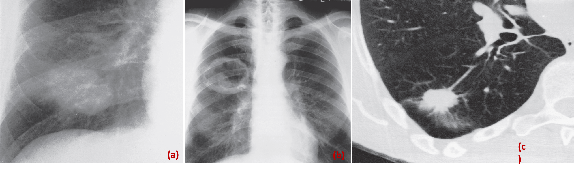 - **A spiculated mass (c) is shown on CT