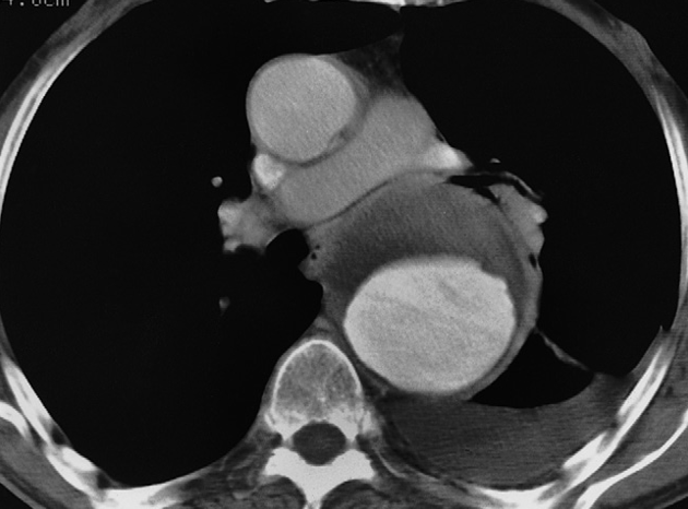 CT showing an aneurysm of the descending aorta. The lumen has been opacified by intravenous contrast enhancement. The unopacified component is clot lining the aneurysm -///