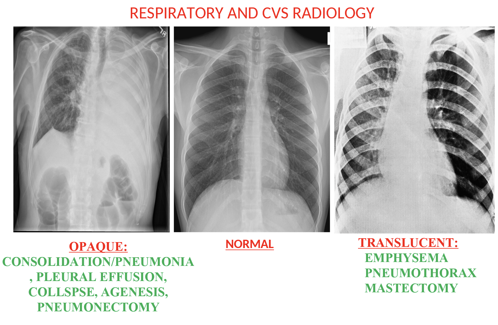 The information on a CXR is largely dependent on the contrast between air in the lungs compared with the opacity of the heart, blood vessels, mediastinum and diaphragm.