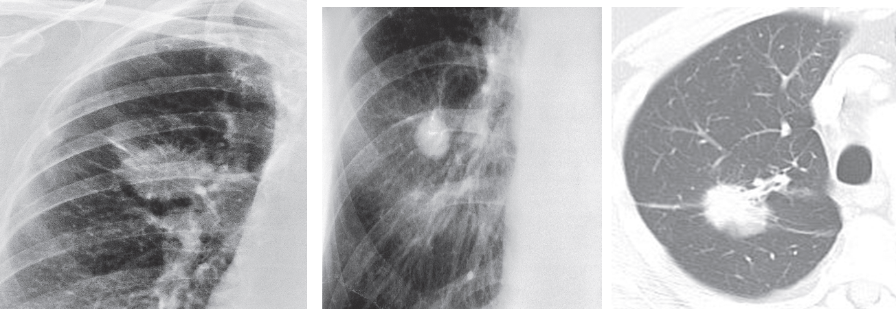 The large size and the irregular infiltrating edge are important diagnostic features suggesting primary carcinoma of the lung. (b) small size & relatively smooth border leads to a wider differential diagnosis. (c) Typical bronchial carcinoma on CT showing an infiltrating edge.