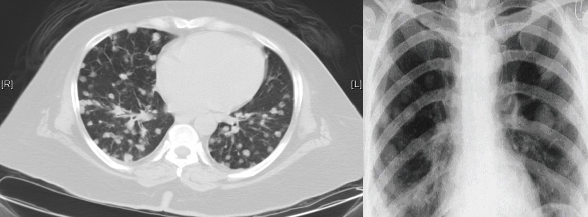 X-ray chest (PA view) of a patient with lung metastases Multiple pulmonary nodules w/ circumscribed margins can be seen in both lungs*